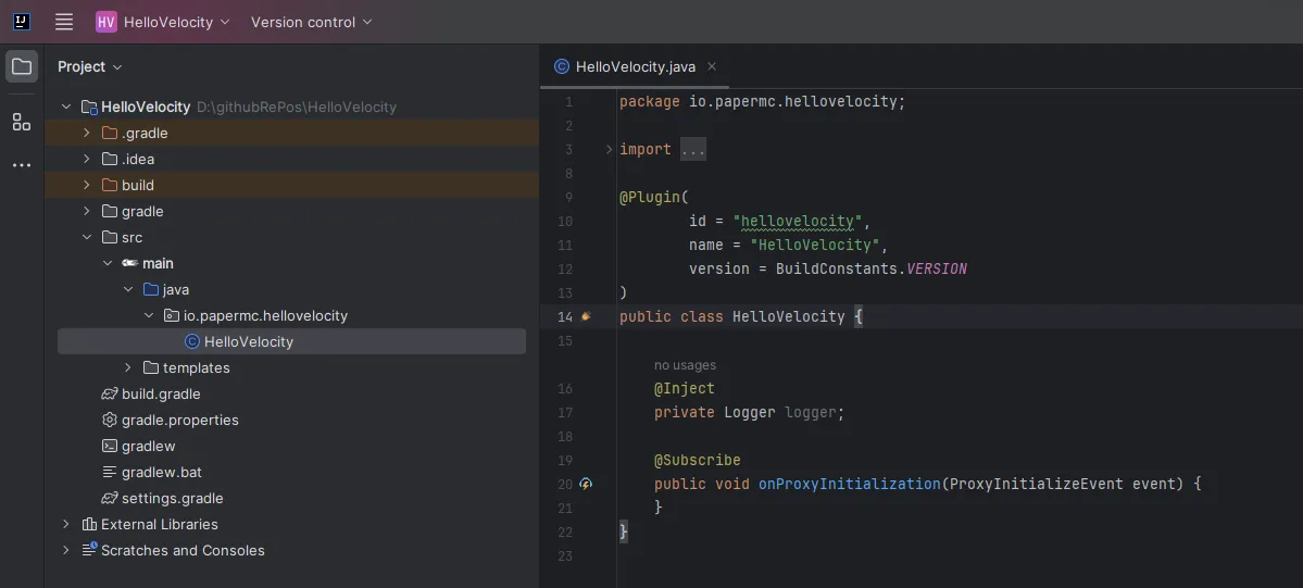Section titled “Set up your build system”You will need to set up a build system before you continue. While it is possible to write Velocity plugins without one, having a build system will make your life a lot less difficult.
